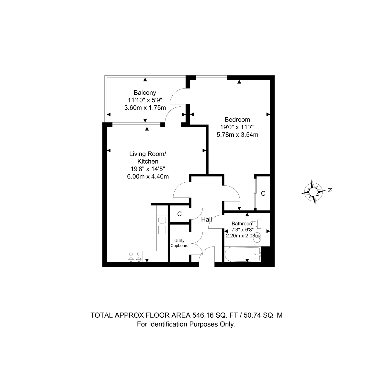 Further benefits include utility cupboard, double glazing, gas central heating, balcony, communal gardens, and access to private gym facilities. Total Internal Area approx: 546.16 sq ft (50.74 sq m).