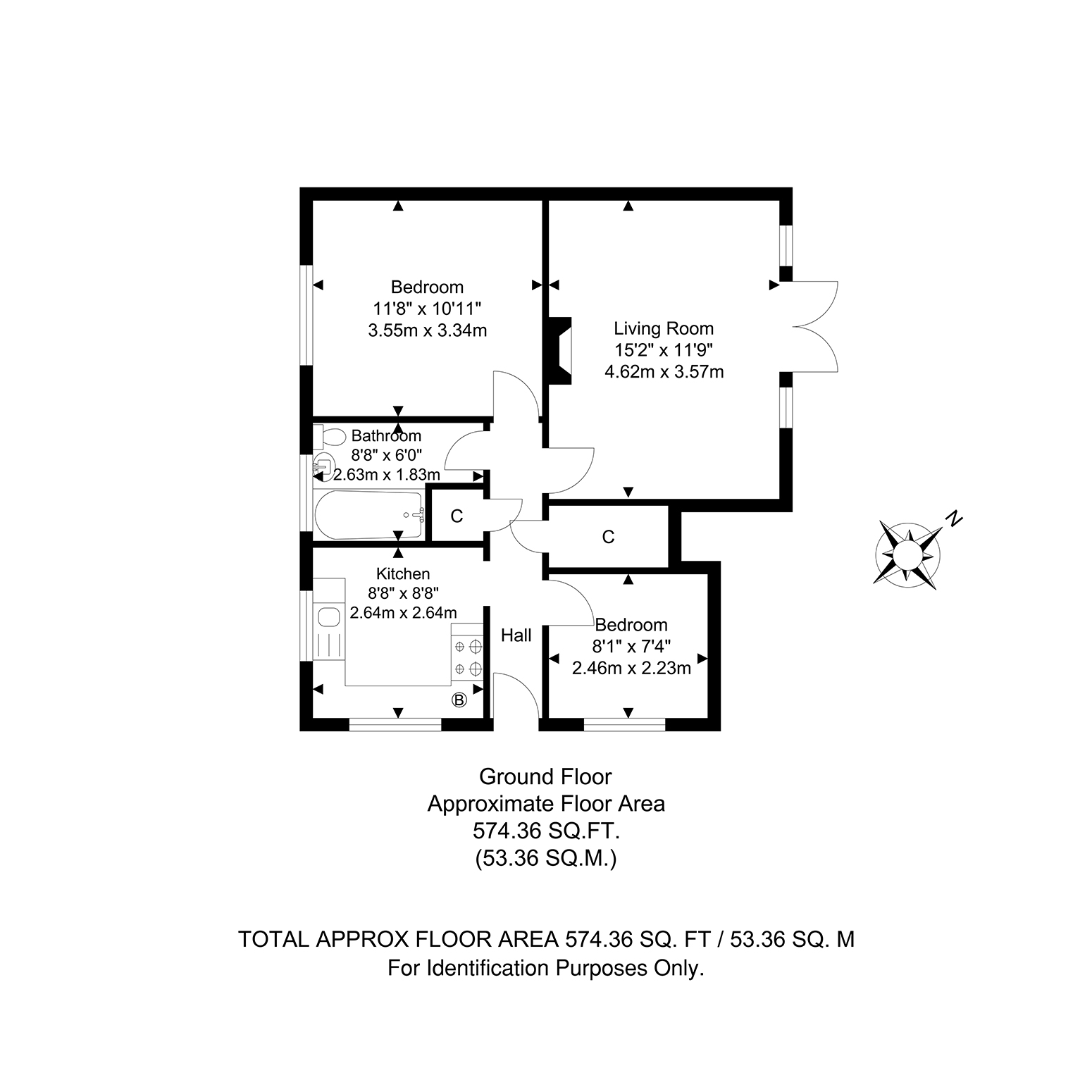 Total Internal Area approx: 574.36 sq ft (53.36 sq m). CHAIN FREE.