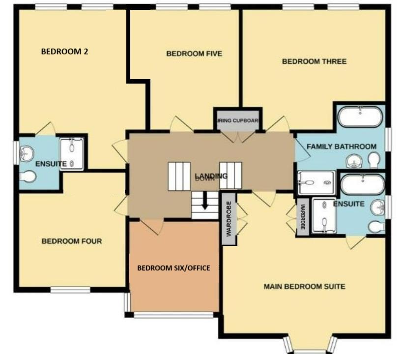 Leading upstairs, the elegant split staircase ascends to an impressive gallery landing area, which leads to five double bedrooms, two with en-suites, family bathroom, sixth bedroom/study and large airing cupboard.